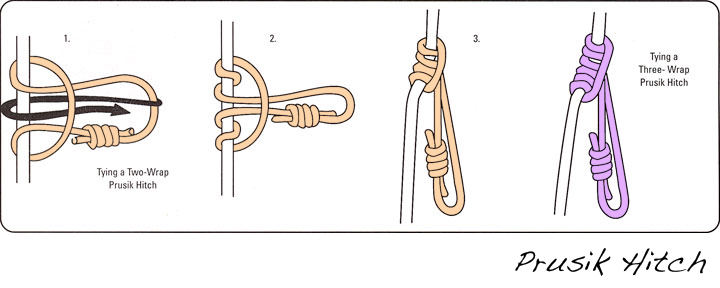 The prusik hitch is the friction hitch that every rope guerrilla should know. It’s tied with a loop of accessory cord and serves as a “soft” rope grab, gripping when under tension but able to slide when the load is released. It grabs in either direction and makes a great point of connection when working on a horizontal safety or restraint line.